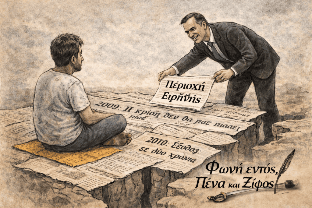 Υπάρχει μια συγκεκριμένη μελωδία που αντηχεί στους διαδρόμους της εξουσίας κάθε φορά που τα τύμπανα του πολέμου αρχίζουν να χτυπούν στη γειτονιά μας. Είναι μια μελωδία γλυκιά, νανουριστική, σχεδιασμένη να καταπραύνει τα πνεύματα και να αποκοιμίζει τις συνειδήσεις. «Μην ανησυχείτε», μας λένε. «Εμείς είμαστε μια όαση ειρήνης. Η Ελλάδα είναι πυλώνας σταθερότητας. Η κρίση δεν θα μας ακουμπήσει». Αυτή η ρητορική δεν είναι καινούργια. Είναι το «μαγικό φίλτρο» που σερβίρεται στον Έλληνα πολίτη εδώ και δεκαετίες, κάθε φορά που η πραγματικότητα γίνεται υπερβολικά σκληρή για να την αντιμετωπίσει κανείς χωρίς αναισθητικό.