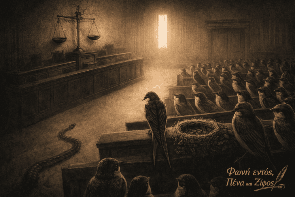 Μια χελιδόνα που θρηνεί μέσα σε ένα δικαστήριο.